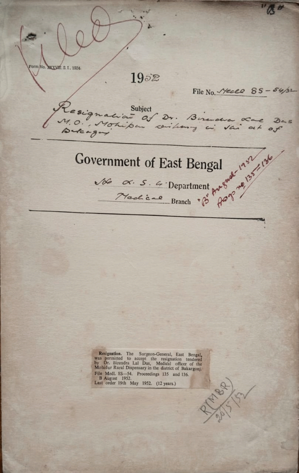Resignation of Dr. Birendra Lal Das M/O, Mohipur Dispensary in the District of Bakarganj.