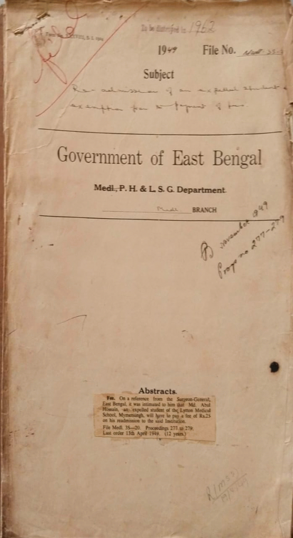 Readmission of an ex-political student examination from the payment of fee proposal for payment to the staff of the Nawabgonj A. G. hospital.