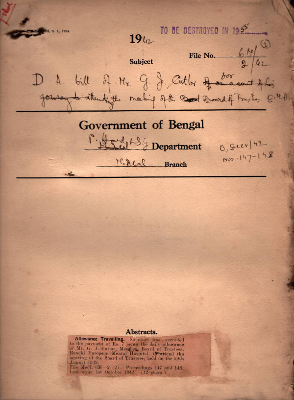 | Rack No. 09; Bundle No. 94 SL No. 7331 Annual accounts of the Albert Victor Leper Hospital for 1941-42 | Rack No. 09; Bundle No. 94 SL No. 7332 Extension of the tenure of the committee for the control and management of the reformatory and Industrial Schools, Alipure | Rack No. 09; Bundle No. 94 SL No. 7333 Inspection to the Civil Surgeon to notify the dates of some of their inspections of Hospitals and Dispensaries to the Public | Rack No. 09; Bundle No. 94 SL No. 7334 D.A. Bill of Dr. G. J. Cuttar for attending the meeting of the Board of Trustees, E.M.H. | Rack No. 09; Bundle No. 94 SL No. 7335 Supply of Calcutta Gazette for the use of the General Council and State Faculty of Ayurvedic Medicine | Rack No. 09; Bundle No. 94 SL No. 7336 Redistribution of the stipends from the Mohsin Fund tenable at the Medical College, Calcutta | Rack No. 09; Bundle No. 94 SL No. 7337 Pay and allowance of members of the I.T.F. when called out or embodied for training |