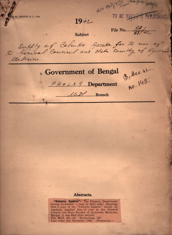 Supply of Calcutta Gazette for the use of the General Council and State Faculty of Ayurvedic Medicine