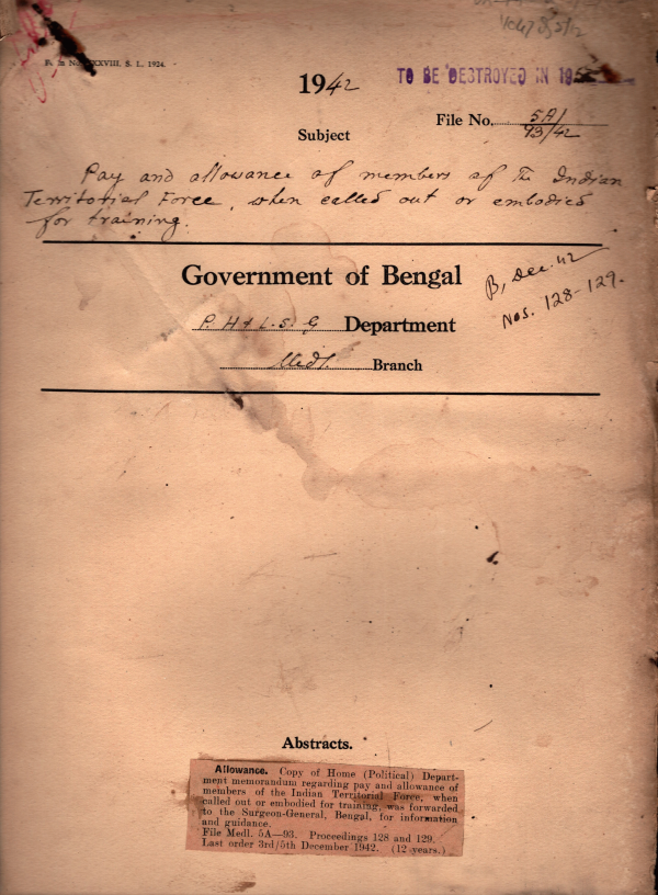 | Rack No. 09; Bundle No. 94 SL No. 7334 D.A. Bill of Dr. G. J. Cuttar for attending the meeting of the Board of Trustees, E.M.H. | Rack No. 09; Bundle No. 94 SL No. 7335 Supply of Calcutta Gazette for the use of the General Council and State Faculty of Ayurvedic Medicine | Rack No. 09; Bundle No. 94 SL No. 7336 Redistribution of the stipends from the Mohsin Fund tenable at the Medical College, Calcutta | Rack No. 09; Bundle No. 94 SL No. 7337 Pay and allowance of members of the I.T.F. when called out or embodied for training | Rack No. 09; Bundle No. 94 SL No. 7338 Defense of India Rules | Rack No. 09; Bundle No. 94 SL No. 7339 Payment of compensation for evacuation of areas and requisition of immovable properties under Defence of India Rules 49 & 75A respectively | Rack No. 09; Bundle No. 94 SL No. 7340 Relinquishment of E.B. Railway Land occupied by the District Board for Diamond Harbour Charitable Dispensary |