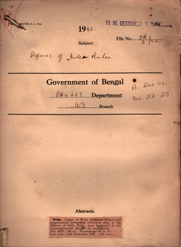 | Rack No. 09; Bundle No. 94 SL No. 7335 Supply of Calcutta Gazette for the use of the General Council and State Faculty of Ayurvedic Medicine | Rack No. 09; Bundle No. 94 SL No. 7336 Redistribution of the stipends from the Mohsin Fund tenable at the Medical College, Calcutta | Rack No. 09; Bundle No. 94 SL No. 7337 Pay and allowance of members of the I.T.F. when called out or embodied for training | Rack No. 09; Bundle No. 94 SL No. 7338 Defense of India Rules | Rack No. 09; Bundle No. 94 SL No. 7339 Payment of compensation for evacuation of areas and requisition of immovable properties under Defence of India Rules 49 & 75A respectively | Rack No. 09; Bundle No. 94 SL No. 7340 Relinquishment of E.B. Railway Land occupied by the District Board for Diamond Harbour Charitable Dispensary | Rack No. 09; Bundle No. 94 SL No. 7341 Criminal Lunatic Sk. Yusuf |