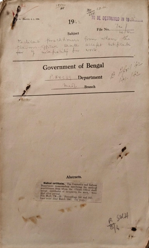 | Rack No. 09, Bundle No. 103, SI No. 8112 Improvement of the S.N.P. Hospital increase of the nursing staff menials common room providers with indoor games and radio. | Rack No. 09, Bundle No. 103, SI No. 8113 About state medical Faculty Bengal. | Rack No. 09, Bundle No. 103, SI No. 8114 Grant of pay allowance to Dr. S.M. Lahiri teacher of medical Jurisprudence Lytton Medical School Mymensingh for performing the duties of Civil Surgeon in a addition this our duties. | Rack No. 09, Bundle No. 103, SI No. 8115 Medical practitioners from whom the claims officer shall accept certificates of incapacity for work. | Rack No. 09, Bundle No. 103, SI No. 8116 Posting of Khan Sahib Dr. Mashudul Hossain on Super numeracy duty at the medical College Hospital. | Rack No. 09, Bundle No. 103, SI No. 8117 Selector of assistant for training in the use of first aid outfit. | Rack No. 09, Bundle No. 103, SI No. 8118 Medical treatment of Civic guards and special constables of injured on duty. |