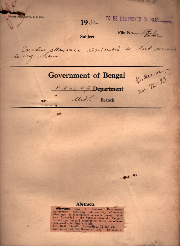 | Rack No. 09; Bundle No. 94 SL No. 7346 Creation of Dinabandhu Charitable Dispensary Trust Fund | Rack No. 09; Bundle No. 94 SL No. 7347 Budget Estimate of the Ranchi European Mental Hospital for the Year 1943-44 (estimate of contribution to the Bengal Govt.) | Rack No. 09; Bundle No. 94 SL No. 7348 Status of British Overseas Airways corporation during the War. | Rack No. 09; Bundle No. 94 SL No. 7349 Exodus Allowance admissible to Govt. servants during leave. | Rack No. 09; Bundle No. 94 SL No. 7350 Detention of non-criminal Lunatic patient Karam Ali | Rack No. 09; Bundle No. 95 SL No. 7351 Establishment of a dispensary at charghat in the District of Rajshahi. | Rack No. 09; Bundle No. 95 SL No. 7352 Supply of 150 ampoules of anti-rabic vaccine to the Faridpur agricultural Farm. |