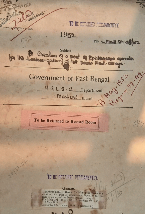 Creation of a post of Epidiascope for the lecture alley of the Dacca Medical College.