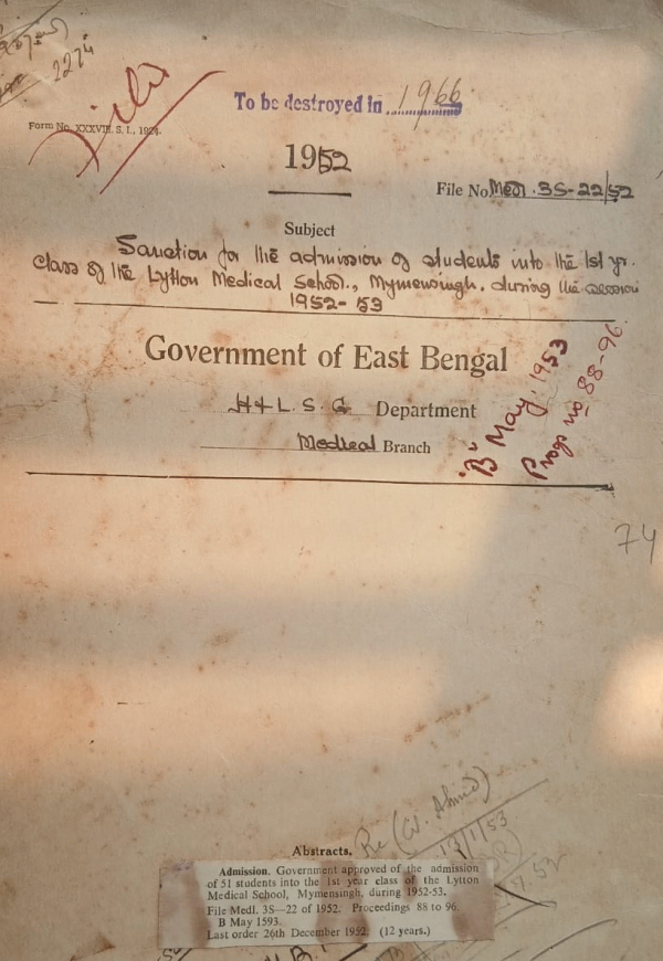 | Rack No. 10, Bundle No. 120 Sl No. 9971 Leave of Major F.W. Allison Professor of Surgeon Medical College, Dacca. | Rack No. 10, Bundle No. 120 Sl No. 9972 Refund of 20% over head charges Realized from Mr. Haque Station Director Radio Pakistan, Dacca. | Rack No. 10, Bundle No. 120 Sl No. 9973 Creation of a post of Epidiascope for the lecture alley of the Dacca Medical College. | Rack No. 10, Bundle No. 120 Sl No. 9974 Sanction for the admission of students into the 1st year class of the Lytton Medical School, Mymensing during the 1952-53. | Rack No. 10, Bundle No. 120 Sl No. 9975 Advertisement bills in connection with recruitment Nurse for P.T.S. Dacca. | Rack No. 10, Bundle No. 120 Sl No. 9976 Temporary appointment of Dr. S.K. Mainuddin Ahmed Teacher of Midwifery Lytton medical school Mymensing to act as Teacher of Surgery of the Said Institution. | Rack No. 10, Bundle No. 120 Sl No. 9977 Grant of leave to the Examiners for conducting the facility of university Examinations. |