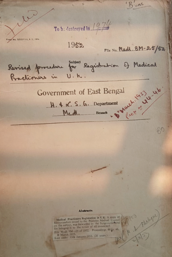 | Rack No. 10, Bundle No. 120 Sl No. 9977 Grant of leave to the Examiners for conducting the facility of university Examinations. | Rack No. 10, Bundle No. 120 Sl No. 9978 Advertisement of posts in foreign countries by the Central/Provincial govt. /Public Service Commission. | Rack No. 10, Bundle No. 120 Sl No. 9979 Grant of Transfer T.A. to officers on deputation or study leaves abroad on return to Pakistan for joining his post. | Rack No. 10, Bundle No. 120 Sl No. 9980 Revised procedure for Registration of Medical Practitioners in U.K. | Rack No. 10, Bundle No. 120, Sl No.9969 Payment of advertisement bills. | Rack No. 10, Bundle No. 121, Sl No. 10000 Training of East Bengal Girls in Nursing in the U.K. 1950-51. | Rack No. 10, Bundle No. 121, Sl No. 10001 Opening of a dispensary at Rajarhat, Jessore for the treatment of Refugees. |