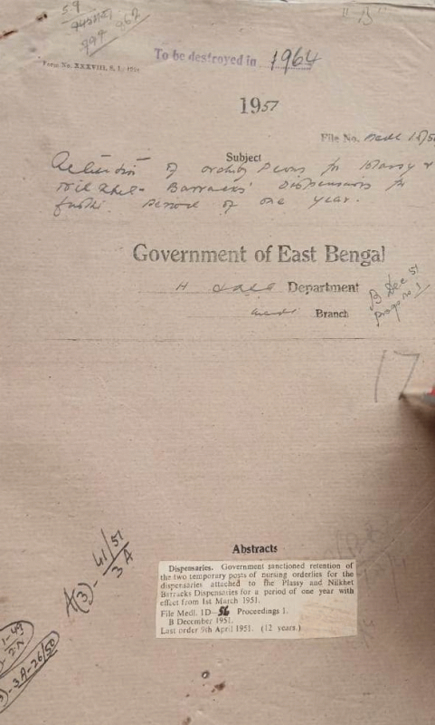 | Rack No. 09, Bundle No. 108, Sl No. 8914 Sanction of extra remuneration to the staff of the Lytton Medical School, Mymensingh. | Rack No. 09, Bundle No. 108, Sl No. 8915 Fixation of pay scales of the clerks attached to the Sadar Provincial Hospital in East Bengal. | Rack No. 09, Bundle No. 108, Sl No. 8916 Restriction in recruiting of women in Superior Service of Pakistan. | Rack No. 09, Bundle No. 108, Sl No. 8917 Retention of the two temporary posts of Nursing for the dispensaries attached to the Plassy and Nilkhet Barracks. | Rack No. 09, Bundle No. 108, Sl No. 8918 Scale of fees to be Charged for Serological Examination in the Bureau of Laboratories. | Rack No. 09, Bundle No. 108, Sl No. 8919 Shitting of stores of the Additional Go down at Narayanganj. | Rack No. 09, Bundle No. 108, Sl No. 8920 Repairs to the T.B. Segregation Hospital at Anupampur in the District of Rajshahi. |