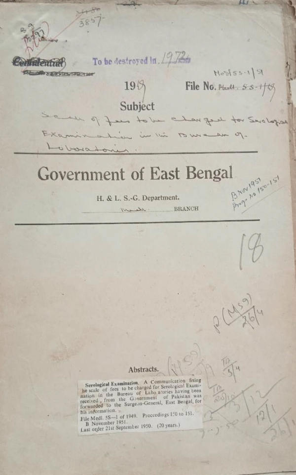 | Rack No. 09, Bundle No. 108, Sl No. 8915 Fixation of pay scales of the clerks attached to the Sadar Provincial Hospital in East Bengal. | Rack No. 09, Bundle No. 108, Sl No. 8916 Restriction in recruiting of women in Superior Service of Pakistan. | Rack No. 09, Bundle No. 108, Sl No. 8917 Retention of the two temporary posts of Nursing for the dispensaries attached to the Plassy and Nilkhet Barracks. | Rack No. 09, Bundle No. 108, Sl No. 8918 Scale of fees to be Charged for Serological Examination in the Bureau of Laboratories. | Rack No. 09, Bundle No. 108, Sl No. 8919 Shitting of stores of the Additional Go down at Narayanganj. | Rack No. 09, Bundle No. 108, Sl No. 8920 Repairs to the T.B. Segregation Hospital at Anupampur in the District of Rajshahi. | Rack No. 09, Bundle No. 108, Sl No. 8921 Sanction as educational grant to the M.C. College Sylhet. |