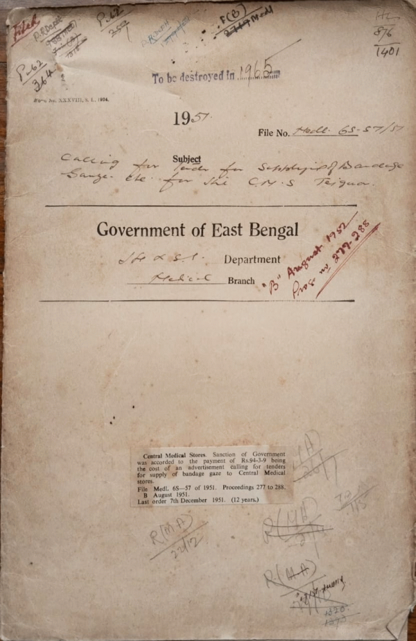 | Rack No. 10, Bundle No. 121, Sl No. 9990 A.Q. by Mr. Md. Abu Hakim Vikrampuri, M.L.A. regarding certain information in respect of the officers and other employees in the Dacca Medical College & Hospital. | Rack No. 10, Bundle No. 121, Sl No. 9991 Fixation of the pay scale of Junior & Senior Staff Nurses of the Mitford Hospital, Dacca. | Rack No. 10, Bundle No. 121, Sl No. 9992 Posting of Dr. A.K.M. Siddique at the Sadar Hospital, Khulna. | Rack No. 10, Bundle No. 121, Sl No. 9993 Calling for tender for supply of bandage gaze etc, to dental Medical Store, Tejgaon. | Rack No. 10, Bundle No. 121, Sl No. 9994 Removal of the Surplus stores from Tranihat Hospital, Bogra. | Rack No. 10, Bundle No. 121, Sl No. 9995 Additional and Alteration for the Proposed Children's ward at Dacca Medical College Hospital. | Rack No. 10, Bundle No. 121, Sl No. 9995 Retention of the temporary staff in the medical Directorate , E.B. |