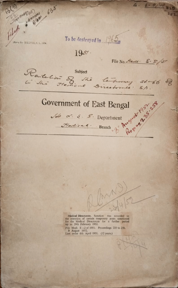 | Rack No. 10, Bundle No. 121, Sl No. 9993 Calling for tender for supply of bandage gaze etc, to dental Medical Store, Tejgaon. | Rack No. 10, Bundle No. 121, Sl No. 9994 Removal of the Surplus stores from Tranihat Hospital, Bogra. | Rack No. 10, Bundle No. 121, Sl No. 9995 Additional and Alteration for the Proposed Children's ward at Dacca Medical College Hospital. | Rack No. 10, Bundle No. 121, Sl No. 9995 Retention of the temporary staff in the medical Directorate , E.B. | Rack No. 10, Bundle No. 121, Sl No. 9997 Panels of vicunas for selection of Sustainable Persons for the award of fellowship. | Rack No. 10, Bundle No. 121, Sl No. 9998 Permission of Dr. A.F.M. Yusuf B.B.B.S. to work in the T.B. ward of the Mitford Hospital, Dacca. | Rack No. 10, Bundle No. 121, Sl No. 9999 Application from Dr. Md. Hossain and others for the post in the E.P.M.S. (Upper). |