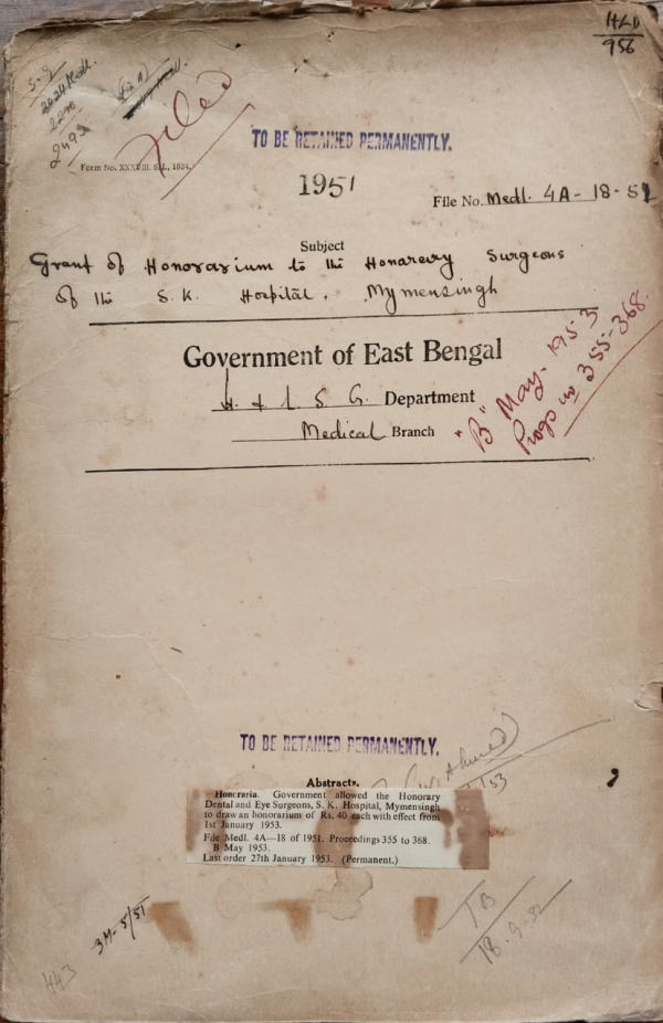 | Rack No. 10, Bundle No. 120, Sl No.9969 Payment of advertisement bills. | Rack No. 10, Bundle No. 121, Sl No. 10000 Training of East Bengal Girls in Nursing in the U.K. 1950-51. | Rack No. 10, Bundle No. 121, Sl No. 10001 Opening of a dispensary at Rajarhat, Jessore for the treatment of Refugees. | Rack No. 10, Bundle No. 121, Sl No. 10002 Grant of Honorarium to the Horney Surgeons of the S.K. Hospital, Mymensingh. | Rack No. 10, Bundle No. 121, Sl No. 10003 Sanction for the purchase of 5 refrigerators for the use of 4 provincial districts. | Rack No. 10, Bundle No. 121, Sl No. 10004 Advertisement of annual tenders for supplying of packing materials for the C.M.S. at Tejgaon. | Rack No. 10, Bundle No. 121, Sl No. 10005 Revised declaration Bond for Assistant Surgeons. |