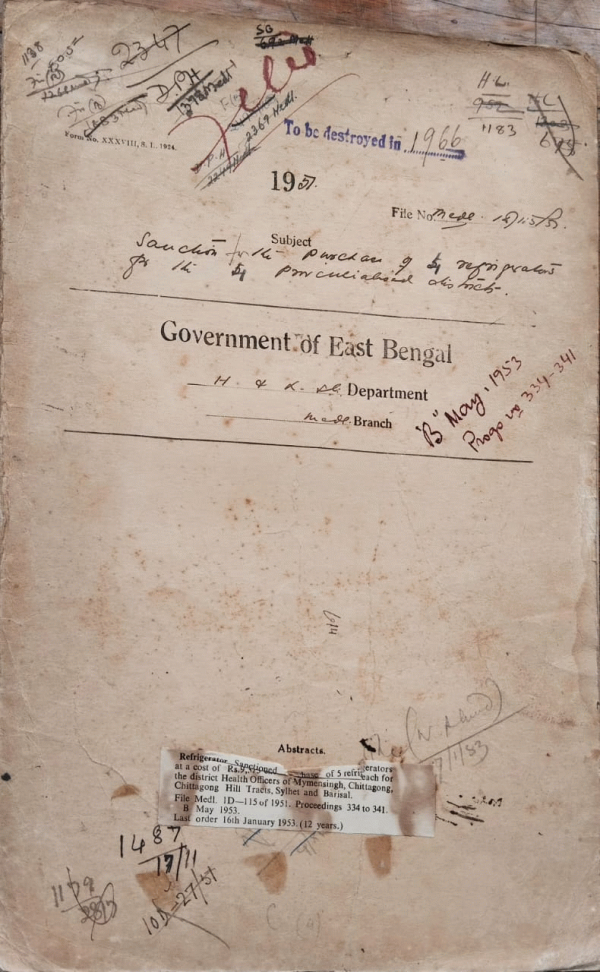 | Rack No. 10, Bundle No. 121, Sl No. 10000 Training of East Bengal Girls in Nursing in the U.K. 1950-51. | Rack No. 10, Bundle No. 121, Sl No. 10001 Opening of a dispensary at Rajarhat, Jessore for the treatment of Refugees. | Rack No. 10, Bundle No. 121, Sl No. 10002 Grant of Honorarium to the Horney Surgeons of the S.K. Hospital, Mymensingh. | Rack No. 10, Bundle No. 121, Sl No. 10003 Sanction for the purchase of 5 refrigerators for the use of 4 provincial districts. | Rack No. 10, Bundle No. 121, Sl No. 10004 Advertisement of annual tenders for supplying of packing materials for the C.M.S. at Tejgaon. | Rack No. 10, Bundle No. 121, Sl No. 10005 Revised declaration Bond for Assistant Surgeons. | Rack No. 10, Bundle No. 121, Sl No. 10006 Creation of additional Posts in the Dacca Medical College Hospital as a result of inspection of the Pakistan Medical Council. |