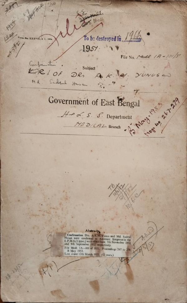 | Rack No. 10, Bundle No. 121, Sl No. 10002 Grant of Honorarium to the Horney Surgeons of the S.K. Hospital, Mymensingh. | Rack No. 10, Bundle No. 121, Sl No. 10003 Sanction for the purchase of 5 refrigerators for the use of 4 provincial districts. | Rack No. 10, Bundle No. 121, Sl No. 10004 Advertisement of annual tenders for supplying of packing materials for the C.M.S. at Tejgaon. | Rack No. 10, Bundle No. 121, Sl No. 10005 Revised declaration Bond for Assistant Surgeons. | Rack No. 10, Bundle No. 121, Sl No. 10006 Creation of additional Posts in the Dacca Medical College Hospital as a result of inspection of the Pakistan Medical Council. | Rack No. 10, Bundle No. 121, Sl No. 10007 Payment of the arrear bills of the A.G. Hospital in East Pakistan for the year 1948-49. | Rack No. 10, Bundle No. 121, Sl No. 10008 Sanction for a monthly recurring grant the Tibbia Habibi College, Dacca. |