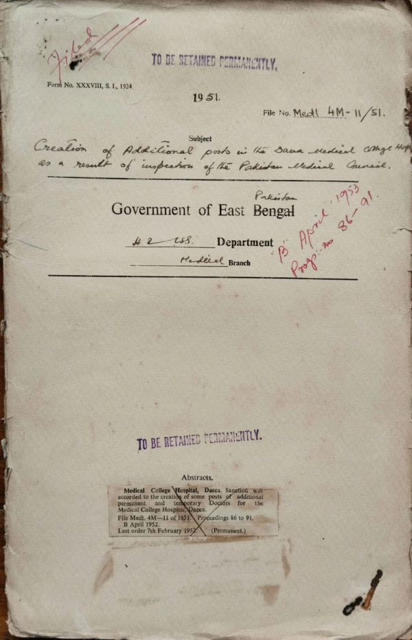 | Rack No. 10, Bundle No. 121, Sl No. 10003 Sanction for the purchase of 5 refrigerators for the use of 4 provincial districts. | Rack No. 10, Bundle No. 121, Sl No. 10004 Advertisement of annual tenders for supplying of packing materials for the C.M.S. at Tejgaon. | Rack No. 10, Bundle No. 121, Sl No. 10005 Revised declaration Bond for Assistant Surgeons. | Rack No. 10, Bundle No. 121, Sl No. 10006 Creation of additional Posts in the Dacca Medical College Hospital as a result of inspection of the Pakistan Medical Council. | Rack No. 10, Bundle No. 121, Sl No. 10007 Payment of the arrear bills of the A.G. Hospital in East Pakistan for the year 1948-49. | Rack No. 10, Bundle No. 121, Sl No. 10008 Sanction for a monthly recurring grant the Tibbia Habibi College, Dacca. | Rack No. 10, Bundle No. 121, Sl No. 10009 Award Of stipend to Muslim Students out of Muslim Education fund for the year 1952-53. |