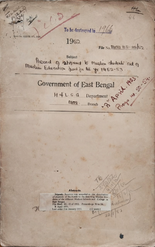 | Rack No. 10, Bundle No. 121, Sl No. 10006 Creation of additional Posts in the Dacca Medical College Hospital as a result of inspection of the Pakistan Medical Council. | Rack No. 10, Bundle No. 121, Sl No. 10007 Payment of the arrear bills of the A.G. Hospital in East Pakistan for the year 1948-49. | Rack No. 10, Bundle No. 121, Sl No. 10008 Sanction for a monthly recurring grant the Tibbia Habibi College, Dacca. | Rack No. 10, Bundle No. 121, Sl No. 10009 Award Of stipend to Muslim Students out of Muslim Education fund for the year 1952-53. | Rack No. 10, Bundle No. 121, Sl No. 10010 Application of Dr. M.M. Rahman, Inspector of Hospital, Dacca for commission in PAMC. | Rack No. 10, Bundle No. 121, Sl No. 10011 Payment of arrear Municipal Taxes in respect of the abolished District Reserve store building in the District of Bogra. | Rack No. 10, Bundle No. 121, Sl No. 10012 Appointment of Dr. Bizon Kanti Paul M.B.B.S, as Demonstrator of Anatomy Medical College, Dacca. |