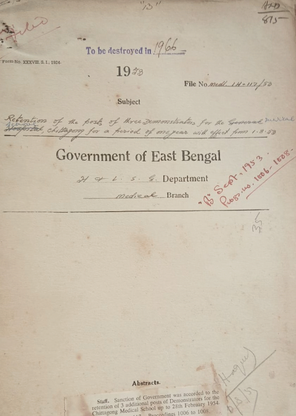 | Rack No. 10, Bundle No. 125 Sl No. 10332 House building advance to Dr. Md. Ibahim. | Rack No. 10, Bundle No. 125 Sl No. 10333 Policy of unification of P.H. & M.S. | Rack No. 10, Bundle No. 125 Sl No. 10334 Sanction of arrear charge under the head "Scholarships & Prizes" to D.M.S. | Rack No. 10, Bundle No. 125 Sl No. 10335 Retention of the Posts of 3 Demonstrators to the C.M.S. for a period of one year. | Rack No. 10, Bundle No. 125 Sl No. 10336 Purchase of Tarpanlins for the central Medical Stores, Tejgaon, Dacca. | Rack No. 10, Bundle No. 125 Sl No. 10337 Appointment of the Drug Licensing Authority and Analyst under the Drugs Act & Rules. | Rack No. 10, Bundle No. 125 Sl No. 10338 Condemnation of the vehicles to the Medical Directorate. |