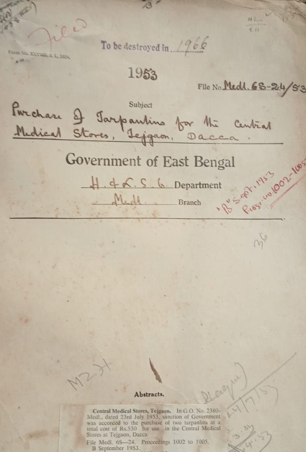 | Rack No. 10, Bundle No. 125 Sl No. 10333 Policy of unification of P.H. & M.S. | Rack No. 10, Bundle No. 125 Sl No. 10334 Sanction of arrear charge under the head "Scholarships & Prizes" to D.M.S. | Rack No. 10, Bundle No. 125 Sl No. 10335 Retention of the Posts of 3 Demonstrators to the C.M.S. for a period of one year. | Rack No. 10, Bundle No. 125 Sl No. 10336 Purchase of Tarpanlins for the central Medical Stores, Tejgaon, Dacca. | Rack No. 10, Bundle No. 125 Sl No. 10337 Appointment of the Drug Licensing Authority and Analyst under the Drugs Act & Rules. | Rack No. 10, Bundle No. 125 Sl No. 10338 Condemnation of the vehicles to the Medical Directorate. | Rack No. 10, Bundle No. 125 Sl No. 10339 Retention of the post whole time peon for the Sadar Hospital, Dinajpur. |