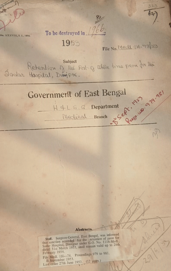 | Rack No. 10, Bundle No. 125 Sl No. 10336 Purchase of Tarpanlins for the central Medical Stores, Tejgaon, Dacca. | Rack No. 10, Bundle No. 125 Sl No. 10337 Appointment of the Drug Licensing Authority and Analyst under the Drugs Act & Rules. | Rack No. 10, Bundle No. 125 Sl No. 10338 Condemnation of the vehicles to the Medical Directorate. | Rack No. 10, Bundle No. 125 Sl No. 10339 Retention of the post whole time peon for the Sadar Hospital, Dinajpur. | Rack No. 10, Bundle No. 125 Sl No. 10340 Supply of Medicines to Ahsanullah Engineering College Dacca. | Rack No. 10, Bundle No. 125 Sl No. 10341 Release of Maqbul Hossain Shaik a criminal lunatic in the D.C.J. | Rack No. 10, Bundle No. 125 Sl No. 10342 Transfer of Funds belongs to Army Units from Pakistan to India. |