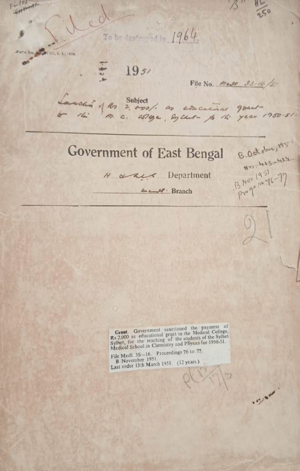 | Rack No. 09, Bundle No. 108, Sl No. 8918 Scale of fees to be Charged for Serological Examination in the Bureau of Laboratories. | Rack No. 09, Bundle No. 108, Sl No. 8919 Shitting of stores of the Additional Go down at Narayanganj. | Rack No. 09, Bundle No. 108, Sl No. 8920 Repairs to the T.B. Segregation Hospital at Anupampur in the District of Rajshahi. | Rack No. 09, Bundle No. 108, Sl No. 8921 Sanction as educational grant to the M.C. College Sylhet. | Rack No. 09, Bundle No. 108, Sl No. 8922 Retention of the V.D. Clinic at Dacca Chittagong & Comilla. | Rack No. 09, Bundle No. 108, Sl No. 8923 Permission to Md. Abu Baker re-examine Student of the Medical College, Dacca. | Rack No. 09, Bundle No. 108, Sl No. 8924 Configuration of Dr. Mainuddin Ahmed, S.A.S. In Civil appointment. |