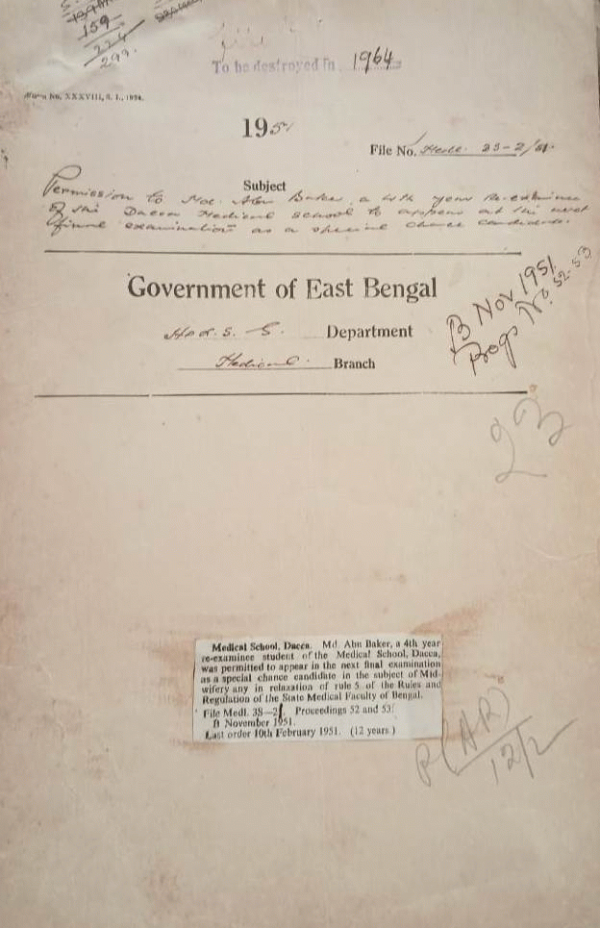 | Rack No. 09, Bundle No. 108, Sl No. 8920 Repairs to the T.B. Segregation Hospital at Anupampur in the District of Rajshahi. | Rack No. 09, Bundle No. 108, Sl No. 8921 Sanction as educational grant to the M.C. College Sylhet. | Rack No. 09, Bundle No. 108, Sl No. 8922 Retention of the V.D. Clinic at Dacca Chittagong & Comilla. | Rack No. 09, Bundle No. 108, Sl No. 8923 Permission to Md. Abu Baker re-examine Student of the Medical College, Dacca. | Rack No. 09, Bundle No. 108, Sl No. 8924 Configuration of Dr. Mainuddin Ahmed, S.A.S. In Civil appointment. | Rack No. 09, Bundle No. 108, Sl No. 8925 Arrear appointment from Subscription from law Estate towards Feni Sub-Divisional Hospital. | Rack No. 09, Bundle No. 108, Sl No. 8926 Appropriation accounts for the years 1948-49. |