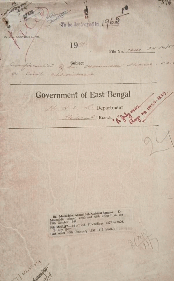 | Rack No. 09, Bundle No. 108, Sl No. 8921 Sanction as educational grant to the M.C. College Sylhet. | Rack No. 09, Bundle No. 108, Sl No. 8922 Retention of the V.D. Clinic at Dacca Chittagong & Comilla. | Rack No. 09, Bundle No. 108, Sl No. 8923 Permission to Md. Abu Baker re-examine Student of the Medical College, Dacca. | Rack No. 09, Bundle No. 108, Sl No. 8924 Configuration of Dr. Mainuddin Ahmed, S.A.S. In Civil appointment. | Rack No. 09, Bundle No. 108, Sl No. 8925 Arrear appointment from Subscription from law Estate towards Feni Sub-Divisional Hospital. | Rack No. 09, Bundle No. 108, Sl No. 8926 Appropriation accounts for the years 1948-49. | Rack No. 09, Bundle No. 108, Sl No. 8927 Creation of 3 Posts of Demonstrators in Anatomy Physiology and Materia Medical for the Chittagong Medical School. |