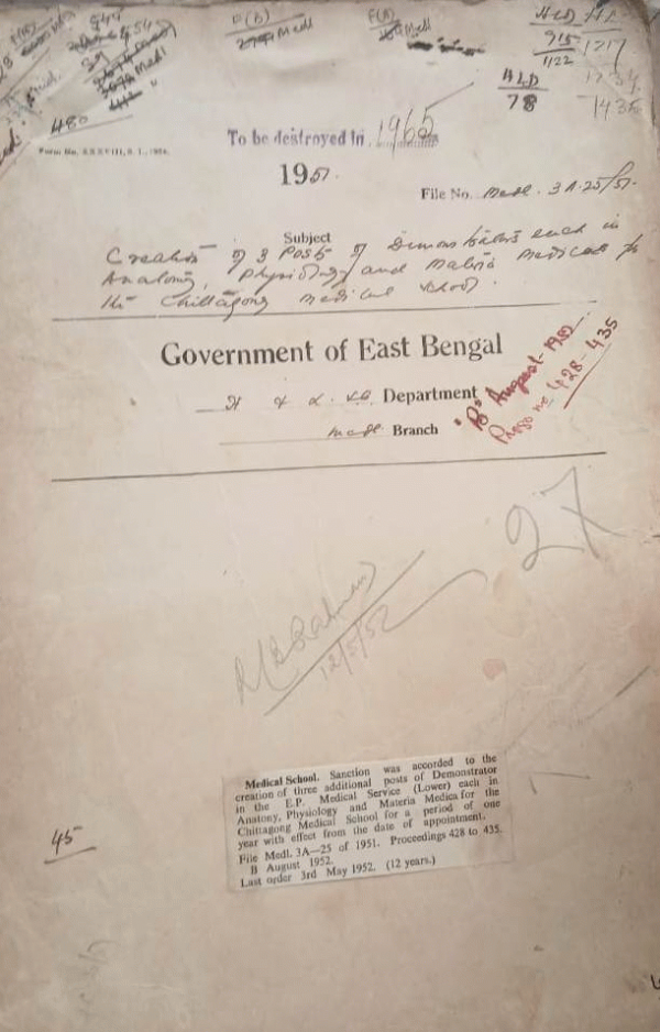 Creation of 3 Posts of Demonstrators in Anatomy Physiology and Materia Medical for the Chittagong Medical School.