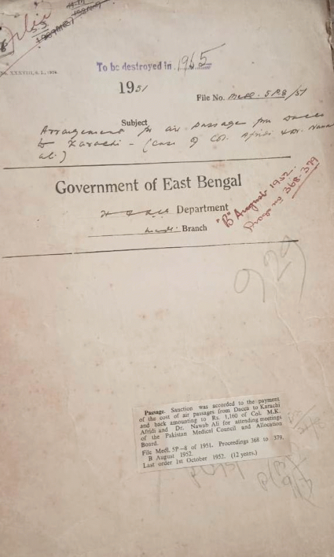 | Rack No. 09, Bundle No. 108, Sl No. 8926 Appropriation accounts for the years 1948-49. | Rack No. 09, Bundle No. 108, Sl No. 8927 Creation of 3 Posts of Demonstrators in Anatomy Physiology and Materia Medical for the Chittagong Medical School. | Rack No. 09, Bundle No. 108, Sl No. 8928 Increasing the rates of washing charges of cloths at Notore and other Sub-Divisional Hospitals of the Rajshahi. | Rack No. 09, Bundle No. 108, Sl No. 8929 Arrangement for air passage from Dacca to Karachi. | Rack No. 09, Bundle No. 108, Sl No. 8930 Realization of the Cost of one mosquito net lost from a Hospital in the District of Bogra. | Rack No. 09; Bundle No. 86 SL No. 6581 Rules regarding the grant of certificates 0 page and nationality to candidates for short service commissions in the India Medical Service. | Rack No. 09; Bundle No. 86 SL No. 6582 Installation of a telephone in the Civil Surgeons residence at Midnapore |