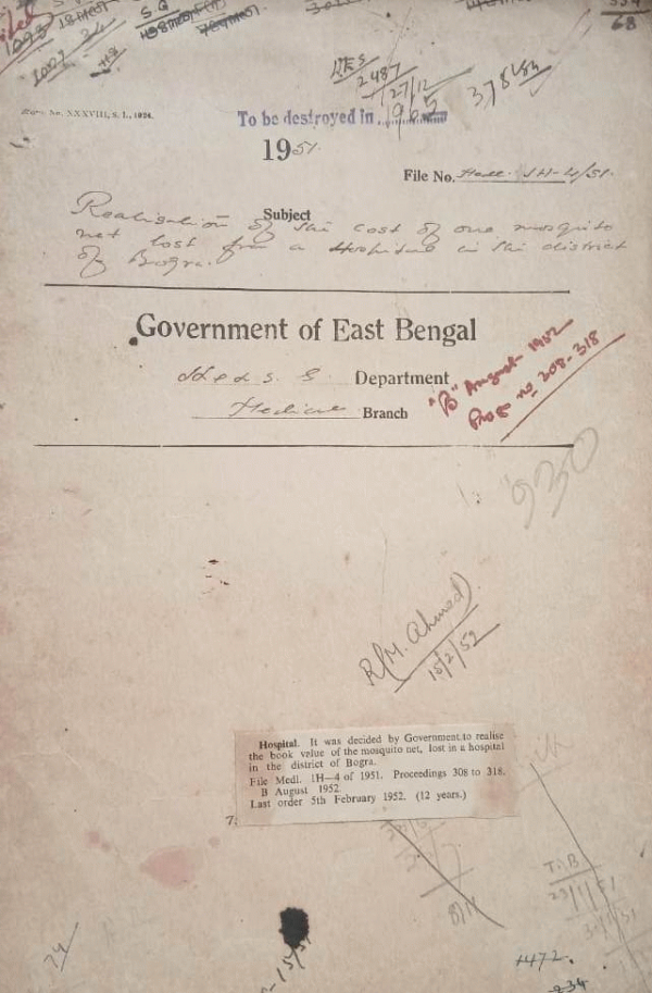 | Rack No. 09, Bundle No. 108, Sl No. 8927 Creation of 3 Posts of Demonstrators in Anatomy Physiology and Materia Medical for the Chittagong Medical School. | Rack No. 09, Bundle No. 108, Sl No. 8928 Increasing the rates of washing charges of cloths at Notore and other Sub-Divisional Hospitals of the Rajshahi. | Rack No. 09, Bundle No. 108, Sl No. 8929 Arrangement for air passage from Dacca to Karachi. | Rack No. 09, Bundle No. 108, Sl No. 8930 Realization of the Cost of one mosquito net lost from a Hospital in the District of Bogra. | Rack No. 09; Bundle No. 86 SL No. 6581 Rules regarding the grant of certificates 0 page and nationality to candidates for short service commissions in the India Medical Service. | Rack No. 09; Bundle No. 86 SL No. 6582 Installation of a telephone in the Civil Surgeons residence at Midnapore | Rack No. 09; Bundle No. 86 SL No. 6583 Eligibility of medical officers for election to the district boards by the local boards. |