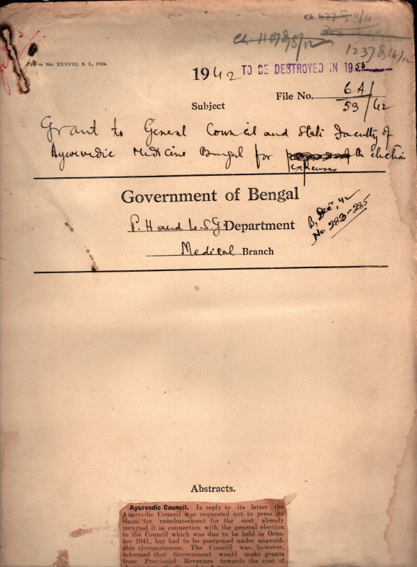 | Rack No. 09; Bundle No. 95 SL No. 7374 Revised scheme for the stamping and distribution of Identity bases. | Rack No. 09; Bundle No. 95 SL No. 7375 Travelling allowance of the Chairman, Malda district board for attending the meeting of the Committee examine the qualifications of Candidates for admission in the Jackson medical School Jalpaiguri. | Rack No. 09; Bundle No. 95 SL No. 7376 Visiting committee Campbell Hospital for 1942-43. | Rack No. 09; Bundle No. 95 SL No. 7377 Grant to the Ayurvedic council towards certain election expenses already incurred by the council. | Rack No. 09; Bundle No. 95 SL No. 7378 Appointment of certain additional staff in the excise Laboratory Chemical Examiners Department. | Rack No. 09; Bundle No. 95 SL No. 7379 Sinking an additional tube well in the Civil Surgeon residence at Rajshahi. | Rack No. 09; Bundle No. 95 SL No. 7380 War Injuries ordinance amendment of |