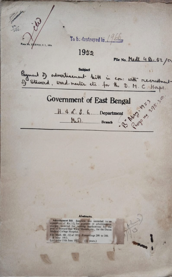 Payment of advertisement bill in connection with recruitment of steward, Ward Master for the Dacca Medical College Hospital.