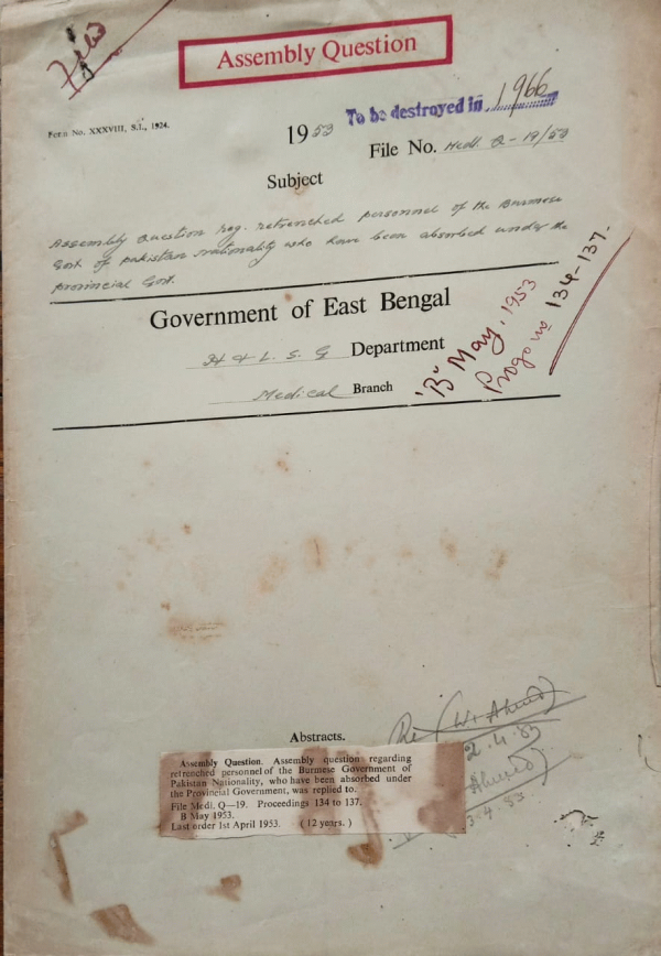 | Rack No. 10, Bundle No. 121, Sl No. 10022 Arrear pay of Sri. Profulla Kumar Ganguli, A.G. Hospital, Dacca. | Rack No. 10, Bundle No. 121, Sl No. 10023 Payment of the advertisement charges to the Statement for inviting application for Technicians in Dacca Medical College. | Rack No. 10, Bundle No. 121, Sl No. 10024 No. of employees of the minority community in the respective Department. | Rack No. 10, Bundle No. 121, Sl No. 10025 A.Q. regarding retrenched Personnel of the Burmese govt. of Pakistan Nationality. | Rack No. 10, Bundle No. 121, Sl No. 10026 Remuneration to members of the lower subordinate Establishment for performing the watch and ward duty to the students hostels. | Rack No. 10, Bundle No. 121, Sl No. 10027 A.Q. regarding Facility of Therapeutic and Preventive Mental Health. | Rack No. 10, Bundle No. 121, Sl No. 10028 Sanction to the Advertisement charges for admission of Students in the P.T.S. for Nurses at the Medical College Hospital, Dacca. |