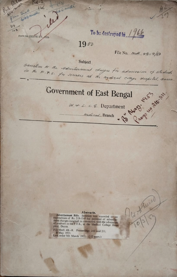Sanction to the Advertisement charges for admission of Students in the P.T.S. for Nurses at the Medical College Hospital, Dacca.