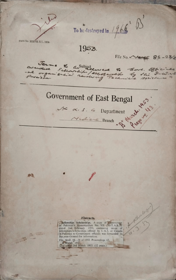 | Rack No. 10, Bundle No. 121, Sl No. 10026 Remuneration to members of the lower subordinate Establishment for performing the watch and ward duty to the students hostels. | Rack No. 10, Bundle No. 121, Sl No. 10027 A.Q. regarding Facility of Therapeutic and Preventive Mental Health. | Rack No. 10, Bundle No. 121, Sl No. 10028 Sanction to the Advertisement charges for admission of Students in the P.T.S. for Nurses at the Medical College Hospital, Dacca. | Rack No. 10, Bundle No. 121, Sl No. 10029 Terms to be allowed to govt. Official awarded fellowship by the I.O. rendering technical Assistance to Pakistan. | Rack No. 10, Bundle No. 121, Sl No. 10030 Fixation of pay Dr. W. Mahmud, acting surgeon general, East Bengal. | Rack No. 10, Bundle No. 121, Sl No. 10031 Payment of the bill for repair of the ambulance at the disposal of the Civil Surgeon, Chittagong. | Rack No. 10, Bundle No. 121, Sl No. 10032 Payment of the bill for repair of the ambulance at the disposal of the Civil Surgeon, Chittagong. |