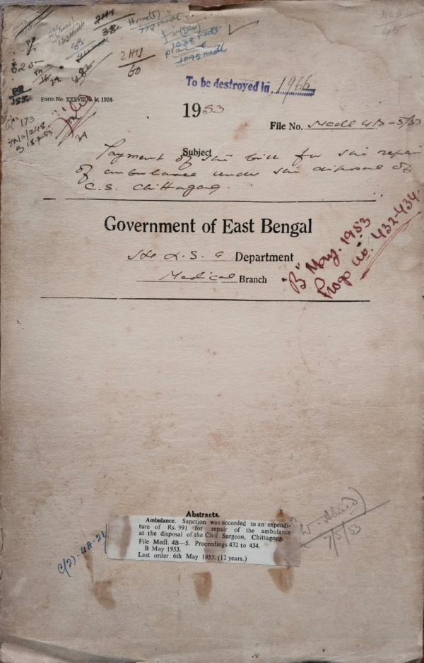 | Rack No. 10, Bundle No. 121, Sl No. 10029 Terms to be allowed to govt. Official awarded fellowship by the I.O. rendering technical Assistance to Pakistan. | Rack No. 10, Bundle No. 121, Sl No. 10030 Fixation of pay Dr. W. Mahmud, acting surgeon general, East Bengal. | Rack No. 10, Bundle No. 121, Sl No. 10031 Payment of the bill for repair of the ambulance at the disposal of the Civil Surgeon, Chittagong. | Rack No. 10, Bundle No. 121, Sl No. 10032 Payment of the bill for repair of the ambulance at the disposal of the Civil Surgeon, Chittagong. | Rack No. 10, Bundle No. 121, Sl No. 10033 Special sanction for advertisement charges amounting to Rs. 88/3/3 only for the appointment of epidiascope operator for Dacca Medical College. | Rack No. 10, Bundle No. 121, Sl No. 10034 Requisition and acquisition of land for the T.B. Hospital, Sylhet. | Rack No. 10, Bundle No. 121, Sl No. 10035 A.Q. by Mr. Nur Ahmed, M.C.A. regarding the Number of Hospital, & Dispensaries in Pakistan. |
