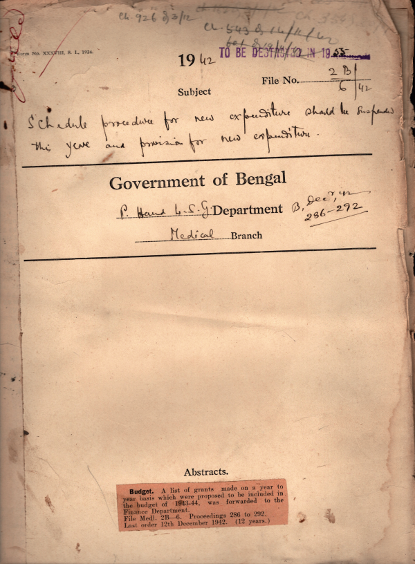 | Rack No. 09; Bundle No. 95 SL No. 7399 Grant of leave to Lt. Col. J.C. De. I.M.S. (R.). | Rack No. 09; Bundle No. 95 SL No. 7400 Enhancement of the permanent advance of the school of Tropical medicine from Rs. 300/- to Rs. 600/- | Rack No. 09; Bundle No. 95 SL No. 7401 Petition from Mr. Amarendra Ch. Sinha electrocardiograph, assistant M.C.H. | Rack No. 09; Bundle No. 95 SL No. 7402 Schedule procedure for new expenditure should be schemes this and provision for new expenditure. | Rack No. 09; Bundle No. 95 SL No. 7403 Imposition of surcharge in all instances where inspection and shipment of stores in carried out by the Indian Stores Department. | Rack No. 09; Bundle No. 95 SL No. 7404 Proposed framing of rules under the C.M. and B.M. act for sites of hospitals and dispensaries. | Rack No. 09; Bundle No. 95 SL No. 7405 Transfer of certain patients form the Ranchi Indian mental Hospital to the mental hospitals or their respective provinces. |
