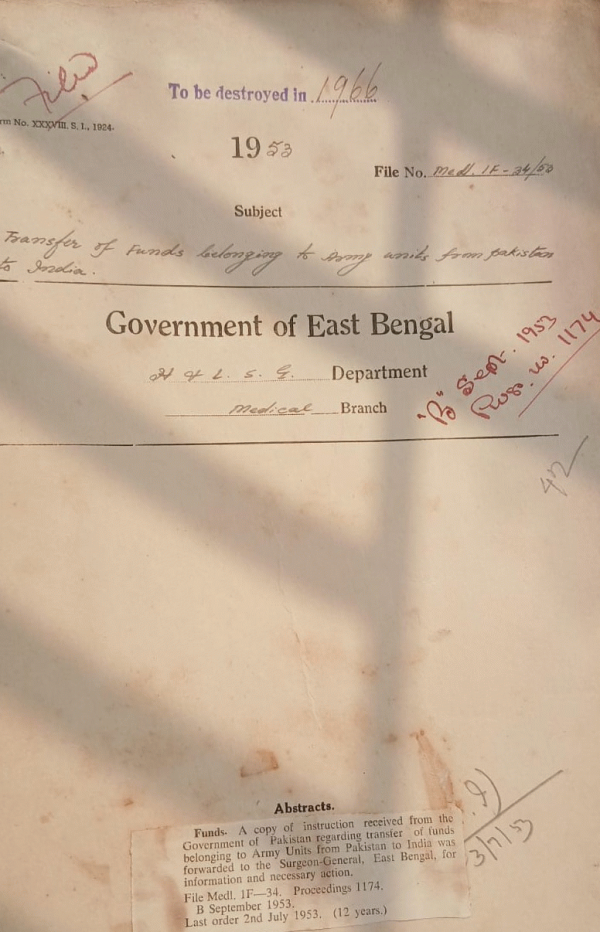 | Rack No. 10, Bundle No. 125 Sl No. 10339 Retention of the post whole time peon for the Sadar Hospital, Dinajpur. | Rack No. 10, Bundle No. 125 Sl No. 10340 Supply of Medicines to Ahsanullah Engineering College Dacca. | Rack No. 10, Bundle No. 125 Sl No. 10341 Release of Maqbul Hossain Shaik a criminal lunatic in the D.C.J. | Rack No. 10, Bundle No. 125 Sl No. 10342 Transfer of Funds belongs to Army Units from Pakistan to India. | Rack No. 10, Bundle No. 125 Sl No. 10343 Purchase of furniture for the office of the District Health Officer, Bakarganj. | Rack No. 10, Bundle No. 125 Sl No. 10344 Schedule of new Major works proposed for inclusion in the Civil Works budget for 1953-54. | Rack No. 10, Bundle No. 125 Sl No. 10345 Proposal for continuance of the Double Shift arrangement in the D.M.S. for a future period of one year. |