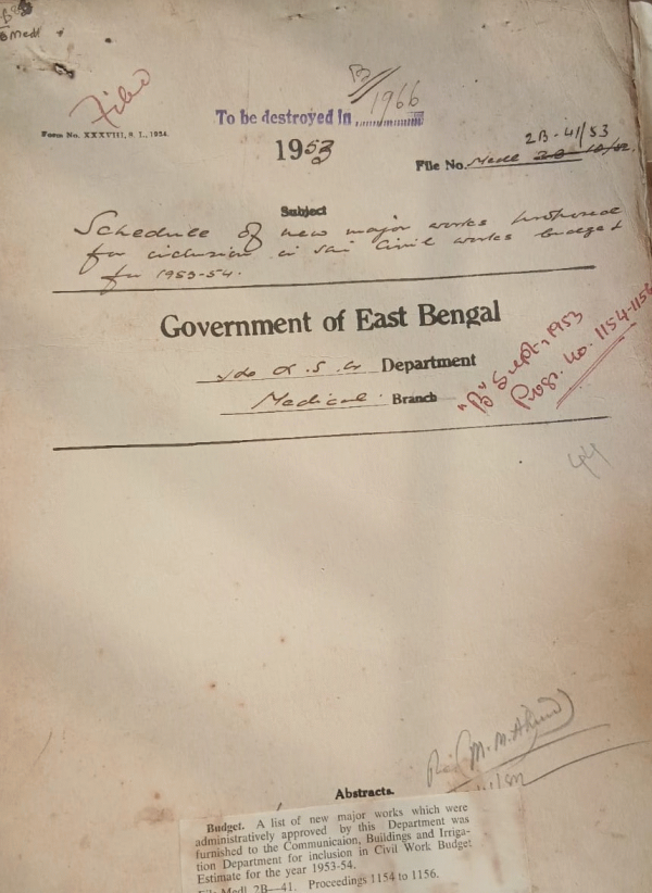 | Rack No. 10, Bundle No. 125 Sl No. 10341 Release of Maqbul Hossain Shaik a criminal lunatic in the D.C.J. | Rack No. 10, Bundle No. 125 Sl No. 10342 Transfer of Funds belongs to Army Units from Pakistan to India. | Rack No. 10, Bundle No. 125 Sl No. 10343 Purchase of furniture for the office of the District Health Officer, Bakarganj. | Rack No. 10, Bundle No. 125 Sl No. 10344 Schedule of new Major works proposed for inclusion in the Civil Works budget for 1953-54. | Rack No. 10, Bundle No. 125 Sl No. 10345 Proposal for continuance of the Double Shift arrangement in the D.M.S. for a future period of one year. | Rack No. 10, Bundle No. 125 Sl No. 10346 Certifying the Market rates by the circle officers for passing the diet bills of the 4 bedded Thana Dispensary | Rack No. 10, Bundle No. 125 Sl No. 10347 Payment of arrear T.A. bill of Dr. N. Talukdar, A/S. Sadar Hospital Dinajpur. |