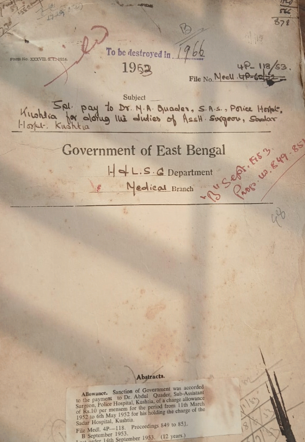 | Rack No. 10, Bundle No. 125 Sl No. 10345 Proposal for continuance of the Double Shift arrangement in the D.M.S. for a future period of one year. | Rack No. 10, Bundle No. 125 Sl No. 10346 Certifying the Market rates by the circle officers for passing the diet bills of the 4 bedded Thana Dispensary | Rack No. 10, Bundle No. 125 Sl No. 10347 Payment of arrear T.A. bill of Dr. N. Talukdar, A/S. Sadar Hospital Dinajpur. | Rack No. 10, Bundle No. 125 Sl No. 10348 Adaptation of the provincial Bengal Medical Act, 1914 to The Bengal Medical, Act 1951. (E.B. Act of 1951). | Rack No. 10, Bundle No. 125 Sl No. 10349 Spl. pay to Dr. Abdul Quder, S.A.S. Police Hospital, Kushtia for doing the duties of A/S. of Sadar Hospital, Kushtia. | Rack No. 10, Bundle No. 125 Sl No. 10350 Retention of the temporary part time staff Hostel a Hashed to the D.M.S. | Rack No. 10, Bundle No. 125 Sl No. 10351 Salary bills of staff of the procurement section of Central Medical Store. |