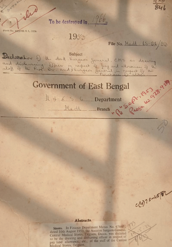 | Rack No. 10, Bundle No. 125 Sl No. 10347 Payment of arrear T.A. bill of Dr. N. Talukdar, A/S. Sadar Hospital Dinajpur. | Rack No. 10, Bundle No. 125 Sl No. 10348 Adaptation of the provincial Bengal Medical Act, 1914 to The Bengal Medical, Act 1951. (E.B. Act of 1951). | Rack No. 10, Bundle No. 125 Sl No. 10349 Spl. pay to Dr. Abdul Quder, S.A.S. Police Hospital, Kushtia for doing the duties of A/S. of Sadar Hospital, Kushtia. | Rack No. 10, Bundle No. 125 Sl No. 10350 Retention of the temporary part time staff Hostel a Hashed to the D.M.S. | Rack No. 10, Bundle No. 125 Sl No. 10351 Salary bills of staff of the procurement section of Central Medical Store. | Rack No. 10, Bundle No. 125 Sl No. 10352 Question of exempting on reciprocal basis, payment of capitation fees by the Students from foreign countries coming for studies in the technical Institution in Pakistan. | Rack No. 10, Bundle No. 125 Sl No. 10353 Minor repairs of the Ambulance of the Mitford Hospital, Dacca. |