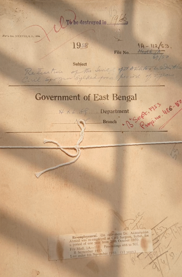 | Rack No. 10, Bundle No. 125 Sl No. 10352 Question of exempting on reciprocal basis, payment of capitation fees by the Students from foreign countries coming for studies in the technical Institution in Pakistan. | Rack No. 10, Bundle No. 125 Sl No. 10353 Minor repairs of the Ambulance of the Mitford Hospital, Dacca. | Rack No. 10, Bundle No. 125 Sl No. 10354 Addition and alteration to the old Muslim Hall building for accommodation of the D.R.S. Chittagong. | Rack No. 10, Bundle No. 125 Sl No. 10355 Retention of the service of Dr. Akhtaruddin Ahmed, C/S. Sylhet for a period of two years. | Rack No. 10, Bundle No. 125 Sl No. 10356 Spl. pay to Dr. Sharafuddin Ahmed, S.A.S., Sadar Hospital, Khulna for doing the duties of A/S. | Rack No. 10, Bundle No. 125 Sl No. 10357 Recovery of collection of payment for services rendered by S.A.S. to Sherpur H. G. Hospital. | Rack No. 10, Bundle No. 125 Sl No. 10358 Instruction for patronizing Pakistan Khaddar in all Govt. Officers. |