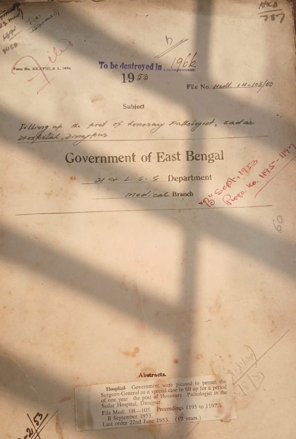 | Rack No. 10, Bundle No. 125 Sl No. 10357 Recovery of collection of payment for services rendered by S.A.S. to Sherpur H. G. Hospital. | Rack No. 10, Bundle No. 125 Sl No. 10358 Instruction for patronizing Pakistan Khaddar in all Govt. Officers. | Rack No. 10, Bundle No. 125 Sl No. 10359 Making over in door Hospital and maternity ward attached to Gopalpur Thana dispensary. | Rack No. 10, Bundle No. 125 Sl No. 10360 Filling up the post of Honorary Pathologist, Sadar Hospital, Dinajpur. | Rack No. 10, Bundle No. 125 Sl No. 10361 Question pending before the E.B.L.A. on the termination of the First Session ending on the 4th April, 1953 | Rack No. 10, Bundle No. 125 Sl No. 10362 Admission of two Pakistan Christian Lunatics at the Ranchi Indian Mental Hospital at Kank in India for treatment. | Rack No. 10, Bundle No. 125 Sl No. 10363 A.Q. by Mrs. Anwara Khatun M.L.A. regarding number of trained + untrained nurses who are sensing under the Govt. |