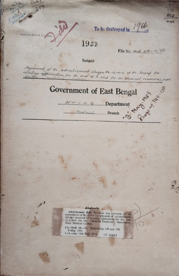 | Rack No. 10, Bundle No. 121, Sl No. 10043 Higher Medical training abroad Dr. Zahiruddin Ahmed. | Rack No. 10, Bundle No. 121, Sl No. 10044 A.Q. regarding latest apparatus and components in the Hospitals for preservation of blood. | Rack No. 10, Bundle No. 121, Sl No. 10045 Free Supply of Streptomycin to Daulat Khanoom a patient of Mitford Hospital. | Rack No. 10, Bundle No. 121, Sl No. 10046 Payment of the advertisement charges of the Insaf for inviting applications for the post of a clerk. | Rack No. 10, Bundle No. 121, Sl No. 10047 Treatment as duty of the period of training of govt. Servants at the Civil Defense training institutions. | Rack No. 10, Bundle No. 121, Sl No. 10048 Payment of the staff attached to the ambulances f the Chittagong. | Rack No. 10, Bundle No. 121, Sl No. 10049 Admission of Md. Khabir Uddin in the 1st year class of Dacca Medical, College. |
