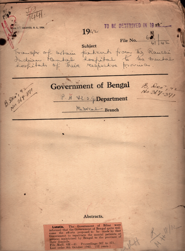Transfer of certain patients form the Ranchi Indian mental Hospital to the mental hospitals or their respective provinces.