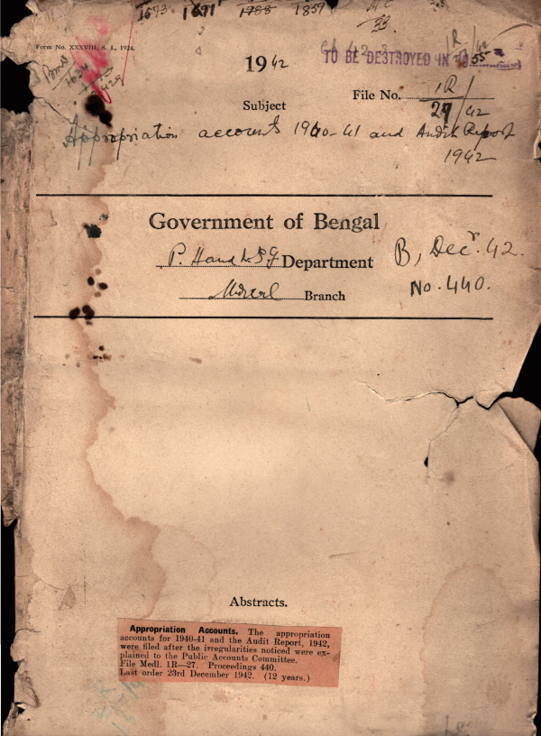| Rack No. 09; Bundle No. 95 SL No. 7404 Proposed framing of rules under the C.M. and B.M. act for sites of hospitals and dispensaries. | Rack No. 09; Bundle No. 95 SL No. 7405 Transfer of certain patients form the Ranchi Indian mental Hospital to the mental hospitals or their respective provinces. | Rack No. 09; Bundle No. 95 SL No. 7406 Grant of Special Pay to Dr. Md. Hussain late officiating professor of medical Jurisprudence M.C.C. | Rack No. 09; Bundle No. 95 SL No. 7407 Appropriation accounts for 1940-41 and the Audit report, 1942. | Rack No. 09; Bundle No. 95 SL No. 7408 Relaxation of Regulation 3 of the S.M.F. Regulations in favour Jagadish Chandra Roy, a student of the Jackson medical school Jalpaiguri. | Rack No. 09; Bundle No. 95 SL No. 7409 Release of criminal lunatic Serajuddin Sikdar. | Rack No. 09; Bundle No. 95 SL No. 7410 Rent of Assam Bengal Railway Signal Engineers Bangalow at Chittagong, occupied by the Civil Surgeon, Chittagong. |