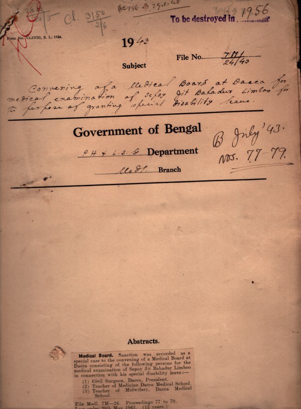 Convening of a medical Board at Dacca for medical examination of Sepoy Jit Bahadur limbo for the Purpose of granting special disability leave.