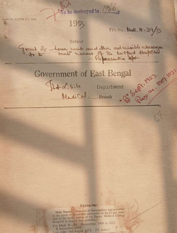 | Rack No. 10, Bundle No. 125 Sl No. 10364 Retention of Dr. Zeaul Hasan Khan, A/S. on duty to appointment as Demonstrator, Dow Medical College, Karachi. | Rack No. 10, Bundle No. 125 Sl No. 10365 A.Q. by Mr. Dhananjo Roy, Regarding X-Ray apparatus in the Medical Institutions in E.B. | Rack No. 10, Bundle No. 125 Sl No. 10366 Permission to A.G.E.B. to investigate the claim in respect of leave salary of S.K. Daud, Late Duftry, Chemical Exam, Department. | Rack No. 10, Bundle No. 125 Sl No. 10367 Grant of house rent and other admissible allowances to the male nurses of the Mitford Hospital. | Rack No. 10, Bundle No. 125 Sl No. 10368 Retention of the two temporary post of the Lab. Assistant in the Chemical Exam department, E.B. | Rack No. 10, Bundle No. 125 Sl No. 10369 Formation of a committee to assistant relationship between the D.M.C. + Some Medical College in the U.S.A. | Rack No. 10, Bundle No. 125 Sl No. 10370 Retention of the post of clerk in the C/S office, Dacca. |