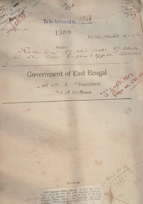| Rack No. 10, Bundle No. 125 Sl No. 10367 Grant of house rent and other admissible allowances to the male nurses of the Mitford Hospital. | Rack No. 10, Bundle No. 125 Sl No. 10368 Retention of the two temporary post of the Lab. Assistant in the Chemical Exam department, E.B. | Rack No. 10, Bundle No. 125 Sl No. 10369 Formation of a committee to assistant relationship between the D.M.C. + Some Medical College in the U.S.A. | Rack No. 10, Bundle No. 125 Sl No. 10370 Retention of the post of clerk in the C/S office, Dacca. | Rack No. 10, Bundle No. 125 Sl No. 10371 Sanction to the drawal of pay of Dr. K.A. Ahmed and Dr. A.K.M. Afsaruzzaman, A/S. on Supply, duty, D.M.C.H. | Rack No. 10, Bundle No. 125 Sl No. 10372 Fixation of pay of Sub-Inspector of Vaccination. | Rack No. 10, Bundle No. 125 Sl No. 10373 Establishment of two drug factories in E.P. + the other in west Pakistan. |