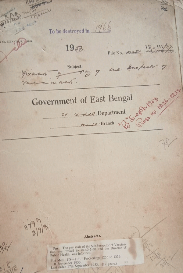 | Rack No. 10, Bundle No. 125 Sl No. 10369 Formation of a committee to assistant relationship between the D.M.C. + Some Medical College in the U.S.A. | Rack No. 10, Bundle No. 125 Sl No. 10370 Retention of the post of clerk in the C/S office, Dacca. | Rack No. 10, Bundle No. 125 Sl No. 10371 Sanction to the drawal of pay of Dr. K.A. Ahmed and Dr. A.K.M. Afsaruzzaman, A/S. on Supply, duty, D.M.C.H. | Rack No. 10, Bundle No. 125 Sl No. 10372 Fixation of pay of Sub-Inspector of Vaccination. | Rack No. 10, Bundle No. 125 Sl No. 10373 Establishment of two drug factories in E.P. + the other in west Pakistan. | Rack No. 10, Bundle No. 125 Sl No. 10374 The Bengal Nurses (E.B. Amendment) Act-1951. | Rack No. 10, Bundle No. 125 Sl No. 10375 Proceedings of the meeting of the development board. |