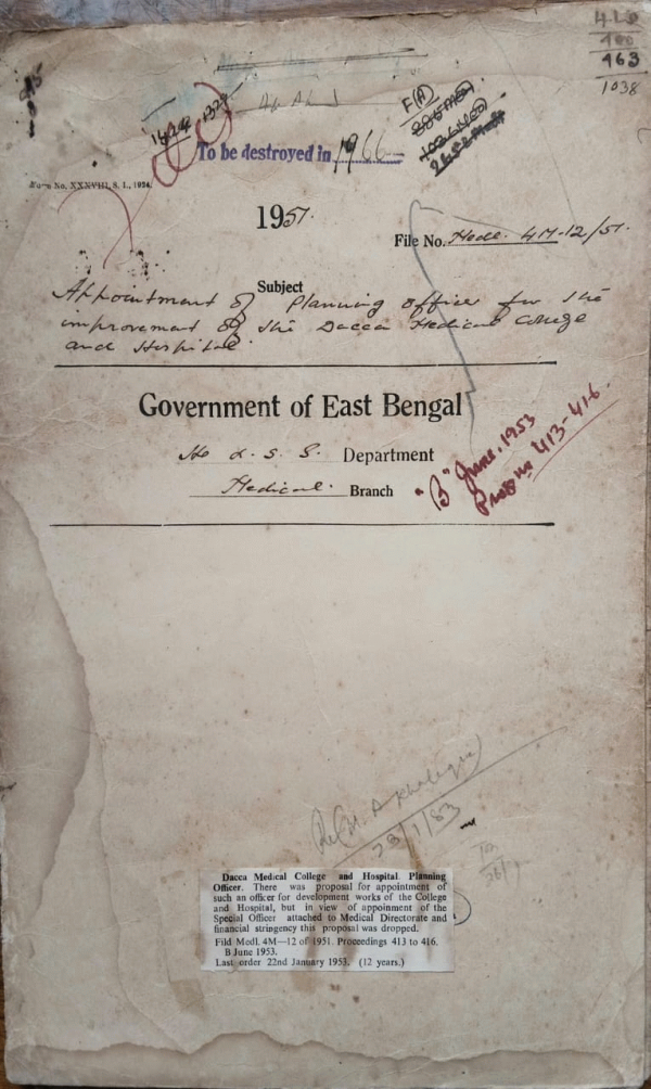 | Rack No. 10, Bundle No. 121, Sl No. 9998 Permission of Dr. A.F.M. Yusuf B.B.B.S. to work in the T.B. ward of the Mitford Hospital, Dacca. | Rack No. 10, Bundle No. 121, Sl No. 9999 Application from Dr. Md. Hossain and others for the post in the E.P.M.S. (Upper). | Rack No. 10, Bundle No. 122, Sl No. 10061 Supply of Chloramycetine and Asuvaumycin of the Hospital. | Rack No. 10, Bundle No. 122, Sl No. 10062 Appointment of planning officer of the improvement of the D.M.C. and Hospital. | Rack No. 10, Bundle No. 122, Sl No. 10063 Claims of the secretary Nokipur H.E. School Khulna. | Rack No. 10, Bundle No. 122, Sl No. 10064 Central (Gazetted) Civil Service (Revision of pay) rules 1951. | Rack No. 10, Bundle No. 122, Sl No. 10065 Fixation of pay to D.A. etc. of Matron of this S.K. Hospital Mymensingh. |